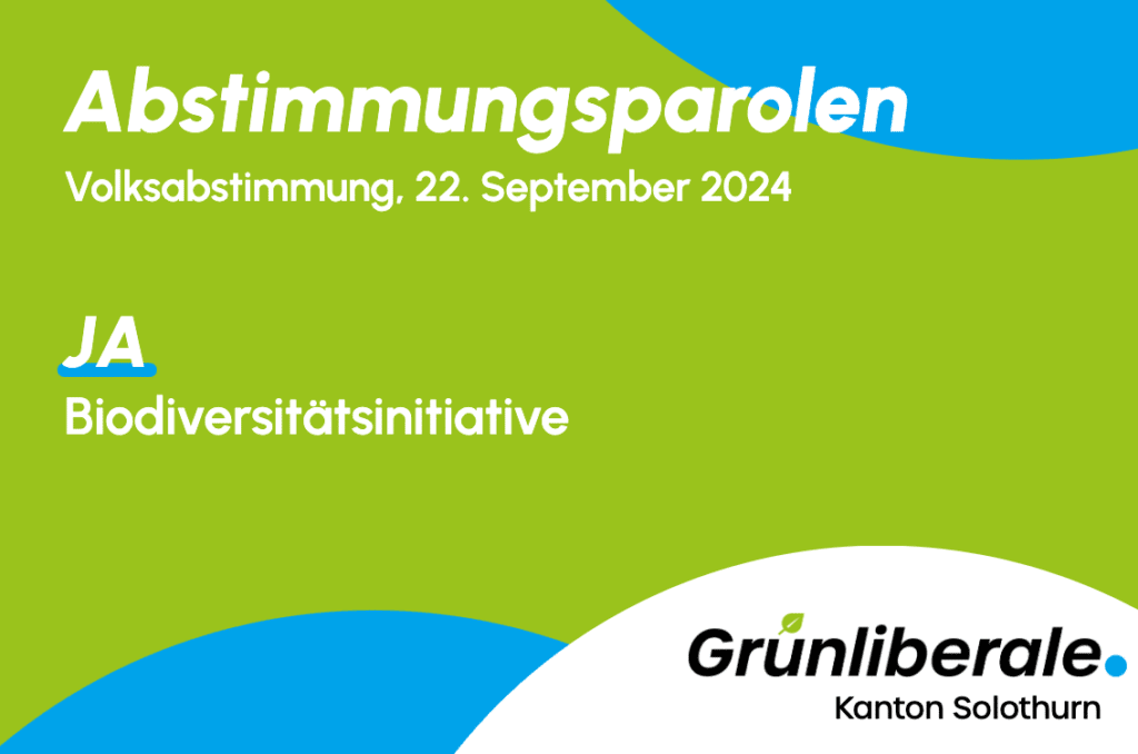 Per E-Voting und Mitgliederversammlung haben die Mitglieder der Grünliberalen Partei Kanton Solothurn (GLP) die Parolen für die nationale Abstimmung zur Biodiversitätsinitiative vom 22. September 2024 gefasst. Die kantonale Partei beschliesst eine Ja Parole zur Biodiversitätsinitiative. Das Voting für die BVG-Reform erfolgt zu einem separaten Zeitpunkt.