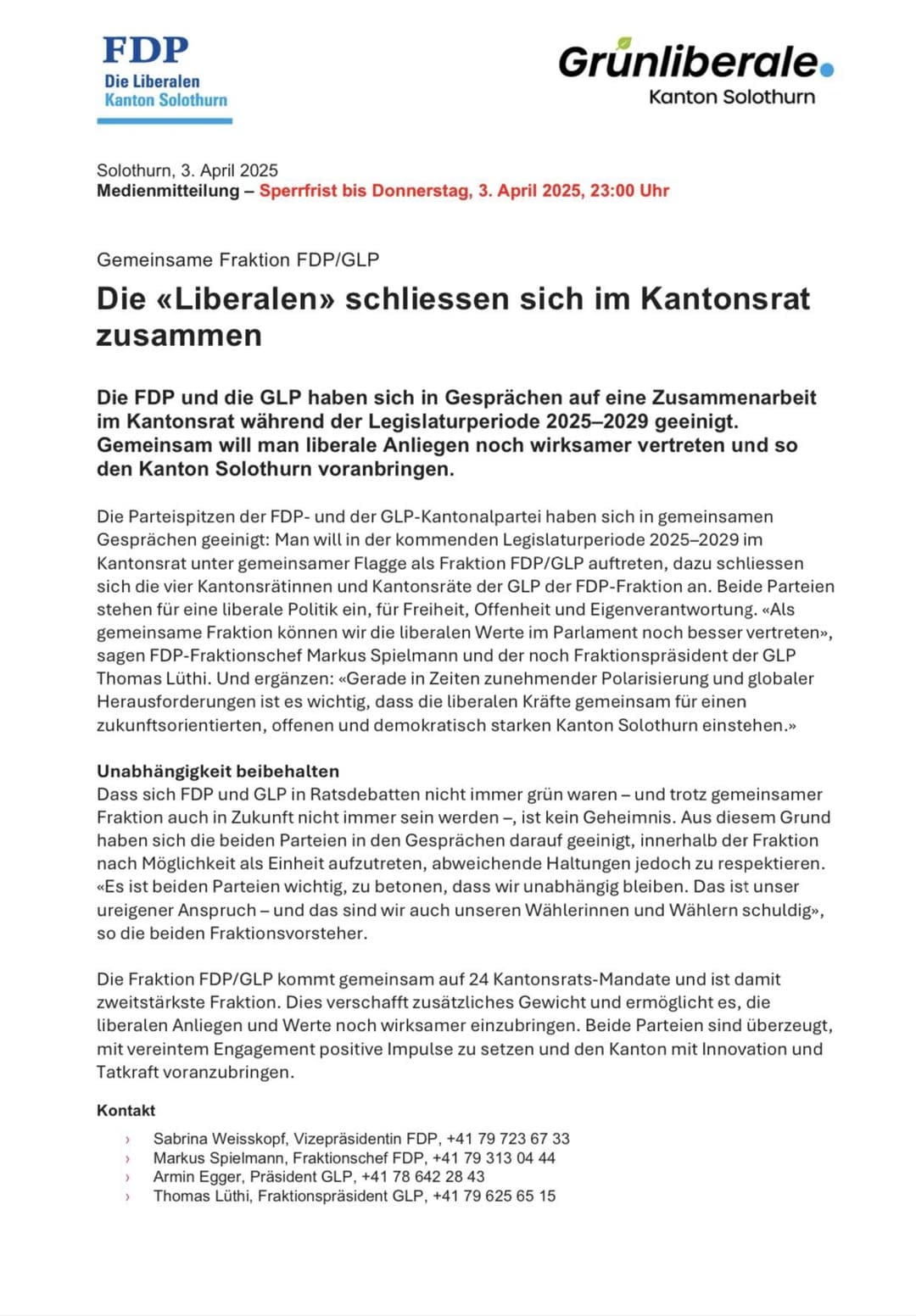 Gemeinsame Fraktion FDP/GLP. Die FDP und die GLP haben sich in Gesprächen auf eine Zusammenarbeit im Kantonsrat während der Legislaturperiode 2025–2029 geeinigt. Gemeinsam will man liberale Anliegen noch wirksamer vertreten und so den Kanton Solothurn voranbringen.